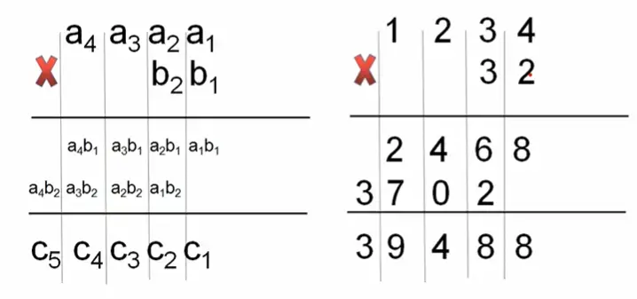 所谓大数相乘(Multiplication algorithm),就是指数字比较大,相乘的结果超出了基本类型的表示范围,所以这样的数不能够直接做乘法运算。这时候可以用小学学的乘法竖式累加模拟乘法,结果储存在数组中。时间复杂度为O(2)