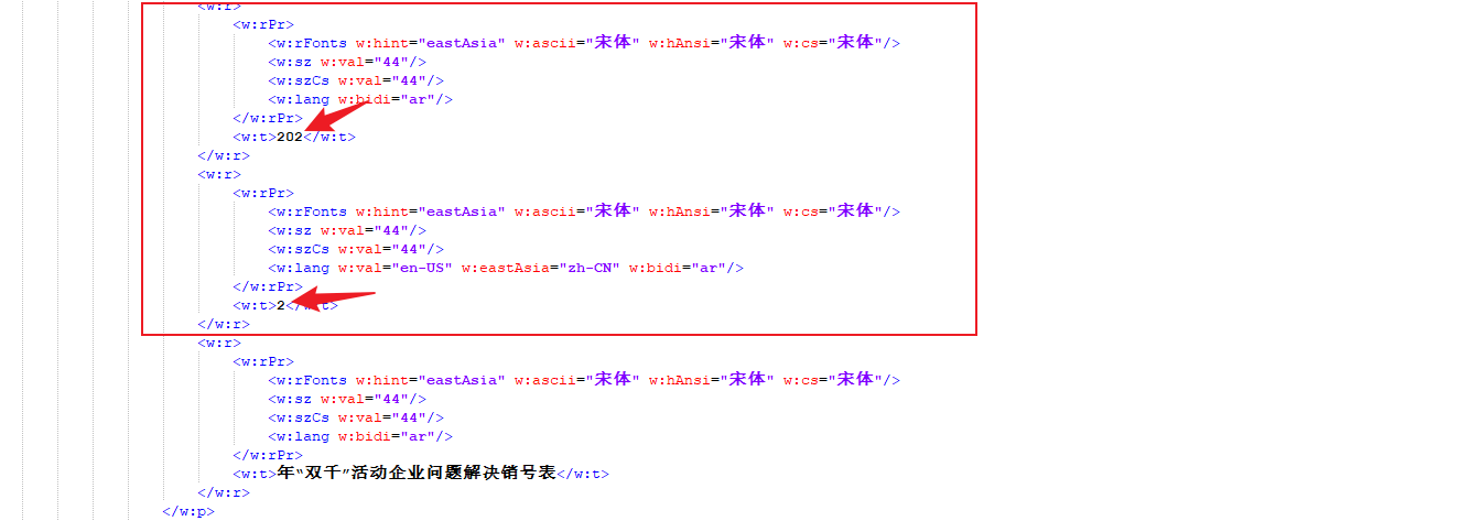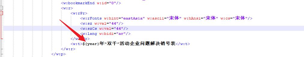 把xml格式文件美化输出后,找出预填充的内容,预填充内容可能被分隔了,需要合并,合并后需要替换为freemarker中的表达式${year}