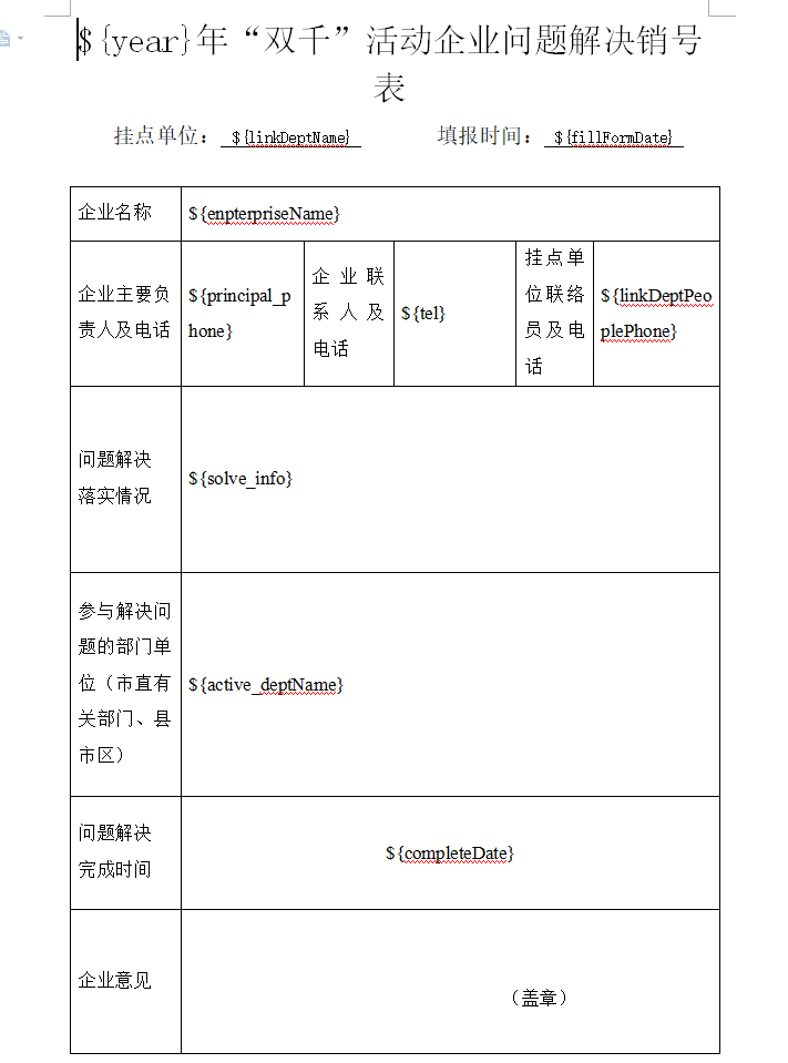 datas.put("year", DateUtil.year(new Date())+""); datas.put("linkDeptName",linkDeptName ); datas.put("enpterpriseName", enpterpriseName); datas.put("fillFormDate", fillFormDate); datas.put("principal_phone",principalPhone); datas.put("tel", tel); datas.put("linkDeptPeoplePhone", linkDeptPeoplePhone); datas.put("solve_info",solveInfo); datas.put("active_deptName", activeDeptName); datas.put("completeDate",completeDate); File maintainFile = WordGeneratorUtil.createDoc(WordGeneratorUtil.FreemarkerTemplate.maintain, "企业问题销号表", datas); return maintainFile; }
