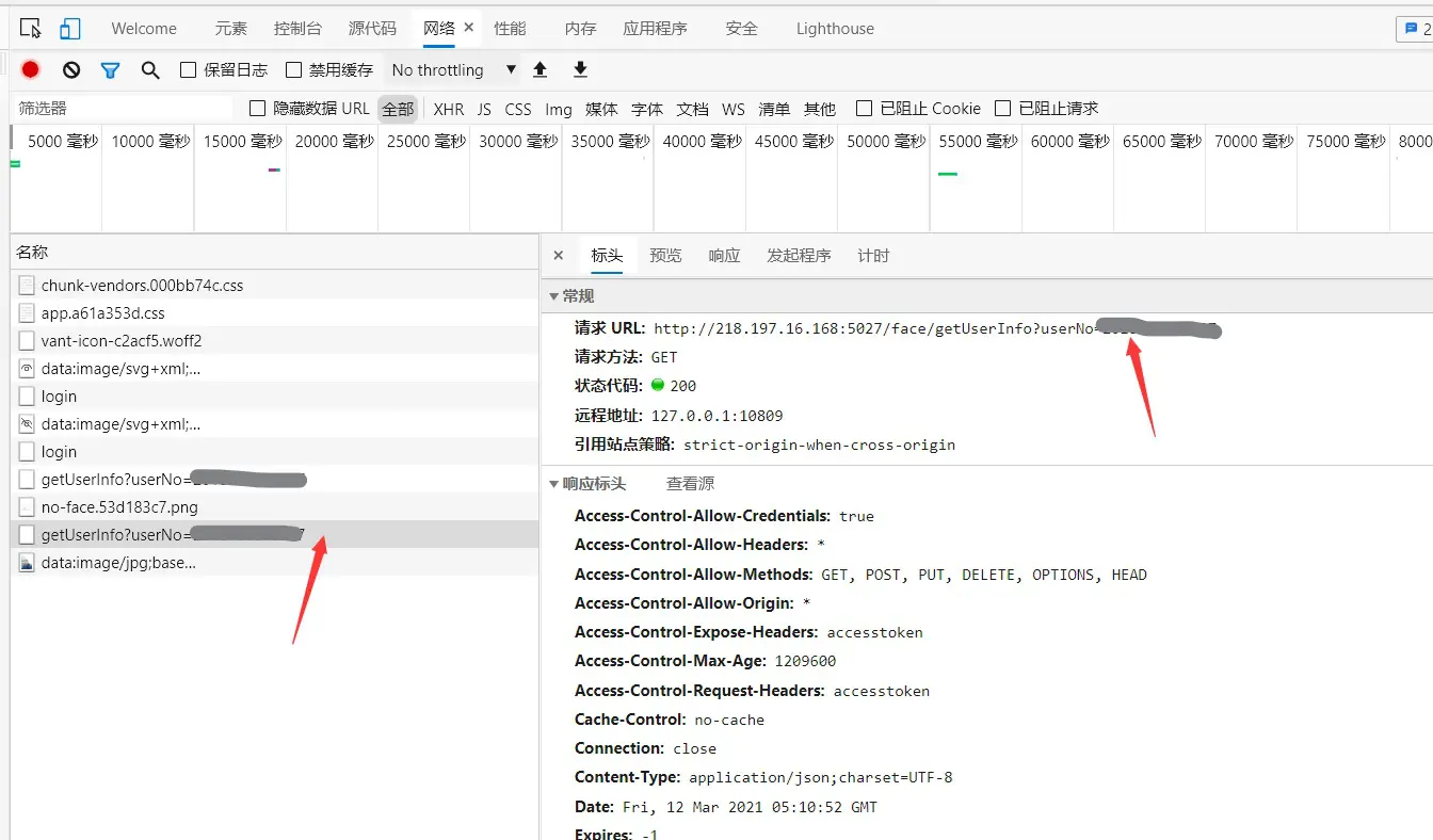 headers = { 'User-Agent': 'Mozilla / 5.0(WindowsNT10.0;Win64;x64) AppleWebKit / 537.36(KHTML, likeGecko) Chrome / 81.0.4044.138Safari / 537.36', } url = 'http://218.197.16.168:5027/face/getUserInfo?userNo='