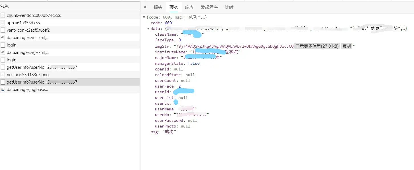 F12刷新审查网络请求,逐个点击查看发现了一个请求有学号构成的接口,这个接口有明显的个人信息imgstr应该就是个人上传的照片了
