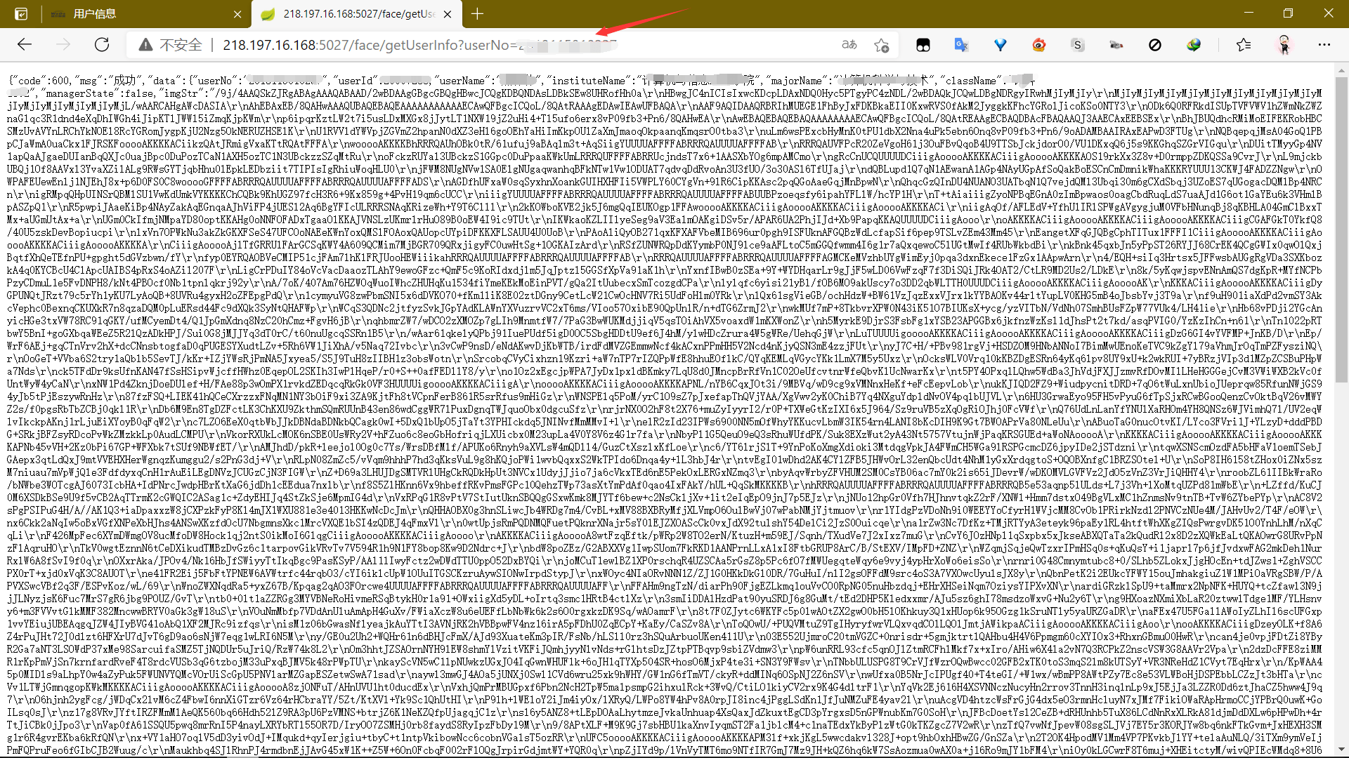 复制接口进入地址栏很幸运的发现这个接口并没有登陆限制,再随便改一个学号数字,发现可以请求到其他人的信息,一顿操作猛如虎,目标就是他了