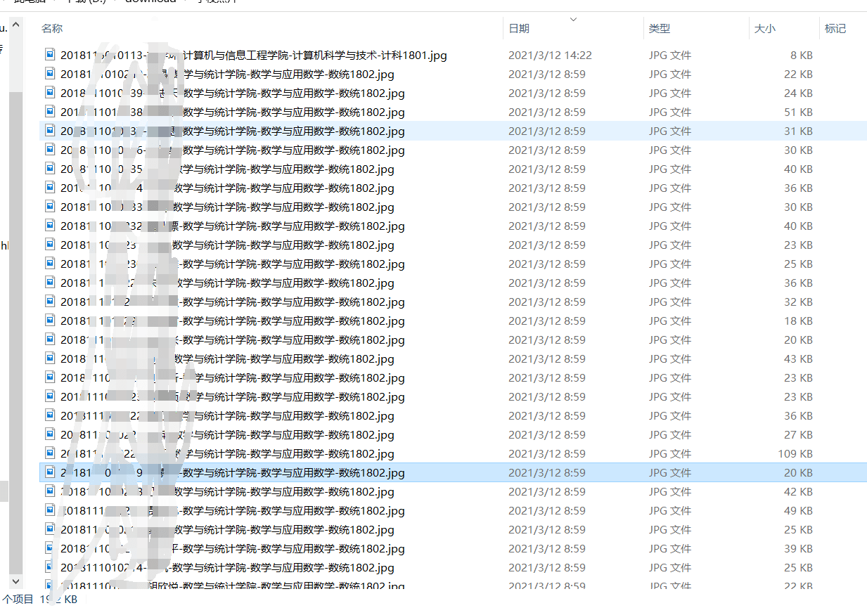 num=2018115010101 for i in range(0,1): #班级(倒数第三个数) for j in range(0,30): #班级人数(倒数两个数) tempurl=url+str(num+i*100+j) print(tempurl) aaa = getImgStr(tempurl, headers) #获取的json数据 try: imgStr=aaa[0] #地址 code=aaa[1] #信息码(600 is ok) if(code!=600): continue userName=aaa[4] userNo=aaa[5] #学号 instituteName=aaa[2] #院系 majorName=aaa[3] #专业 className=aaa[6] #班级 try: imgStr =imgStr.replace('\\r\\n', '') #解密 except: print('未上传信息') imgdata=base64.b64decode(imgStr) imgName='{}-{}-{}-{}-{}.jpg'.format(userNo,userName,instituteName,majorName,className) path='D:\download\学校照片\{}'.format(imgName) with open(path, 'wb') as fo: fo.write(imgdata) except: print(" ")